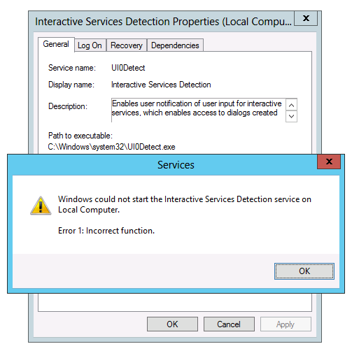 Attempting to start the Interactive Service Detection (UI0Detect) service on Windows 8 and Windows Server 2012 can fail with the incomprehensible