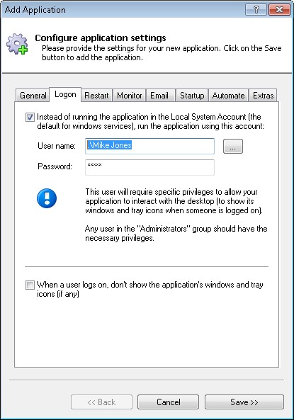 Note that we plan to add the capability to run an application with diminished rights directly from AlwaysUp. That feature will probably included in AlwaysUp version 10.3, which should released to all customers in September/October.