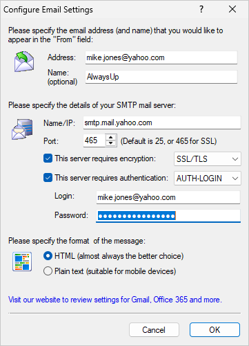 Address: The email address that will be displayed in the “From” field of the email messages sent by AlwaysUp.