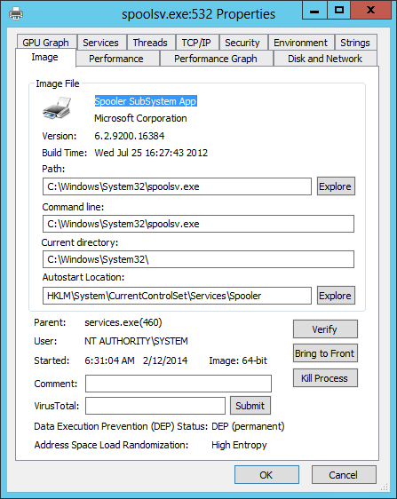Double-clicking an entry allows you to dig into a specific process. For example, here is what is shown for spoolsv.exe, the Windows Print Spooler: