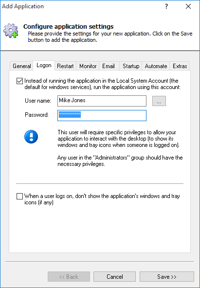 Move to the Logon tab and enter the user name and password of the Windows account in which you installed and configured Java.