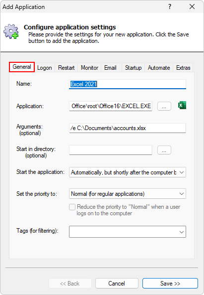 In the Application field, enter the full path to the Excel executable, EXCEL.EXE.