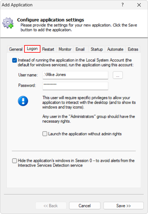 Click over to the Logon tab and enter the username and password of the Windows account in which you installed and