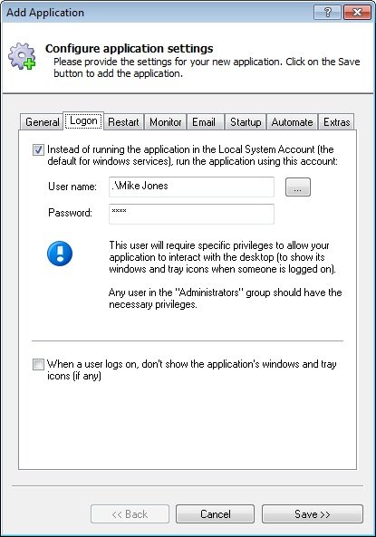 Click over to the Logon tab and enter the user name and password of the account in which you installed and configured SugarSync.