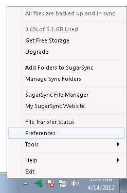 - Right-click on the SugarSync task tray icon and choose Preferences to bring up the SugarSync Preferences Window: