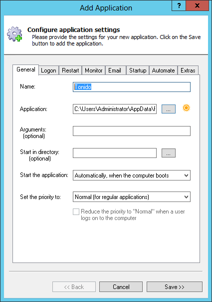 In the Application field, enter the full path to the Tonido application, tonido.exe.