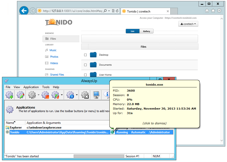 Feel free to stop Tonido in AlwaysUp if you wish to start it from the icon on your desktop.