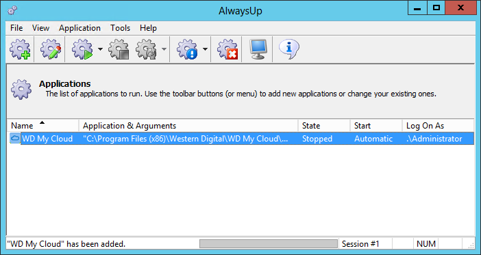 We are now done configuring My Cloud with AlwaysUp, so click the Save >> button. In a couple of seconds, an application called WD My Cloud (or whatever you called yours) will show up in the AlwaysUp window.