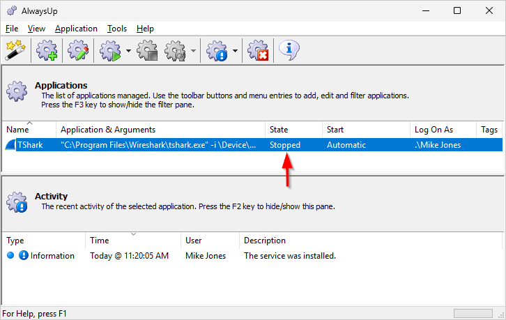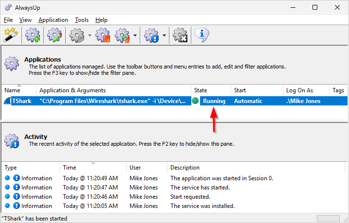 From AlwaysUp, select Application > Report Activity > Today to bring up an HTML report detailing the interaction between AlwaysUp and TShark. The AlwaysUp Event Log Messages page explains the more obscure messages.