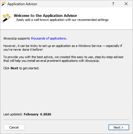 If you are configuring a well-known application, AlwaysUp can often save you even more time. The AlwaysUp Application Advisor walks you through the best settings for several common application types, including Java, Python, Node.js, batch files, WinForms, Dropbox and more: Instead of making you guess which command line, working directory, account, or restart settings to use, the Advisor recommends the best setup and prepares the Service for you. Examples for common application types (Python, Java, Node.js, BAT, etc.)Need detailed instructions for a specific kind of app? Start with these step-by-step guides: